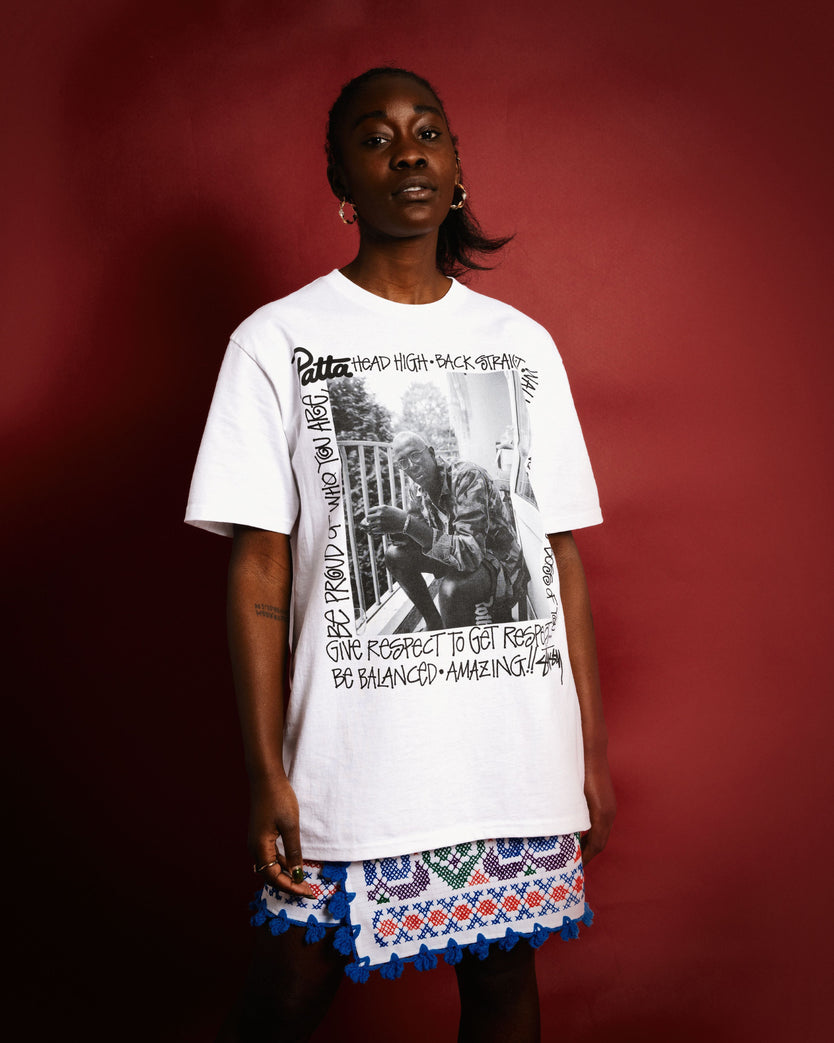 The Patta x Stüssy “Respect Tee” is available now exclusively our mobile app and in our chapter stores in Amsterdam, London, Milan and Lagos. The Patta x Stussy capsule collection will be available this Friday.